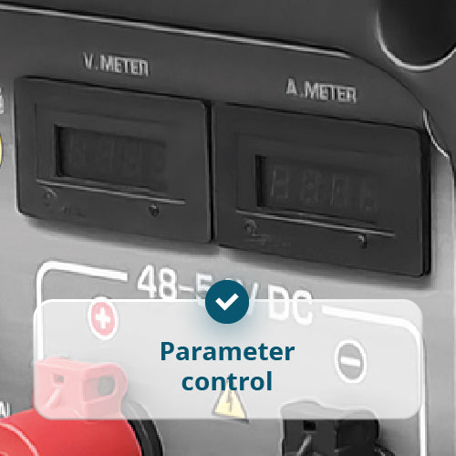 • Automatic operation – in AUTO mode, the generator independently monitors the battery voltage, starts when it drops below 50V, and stops when the output reaches 54.5 ± 0.5 V and the current drops below 20A.