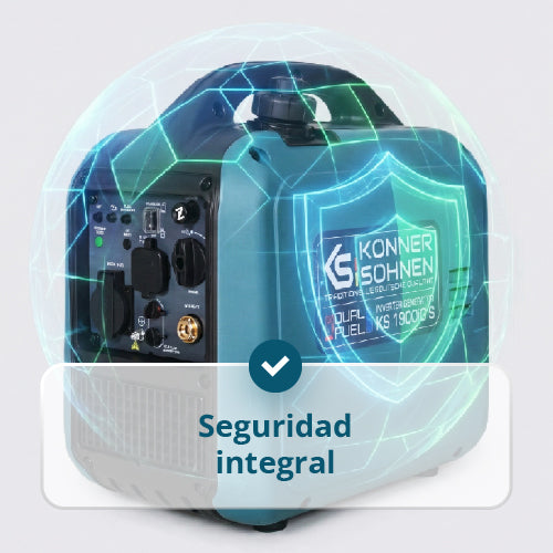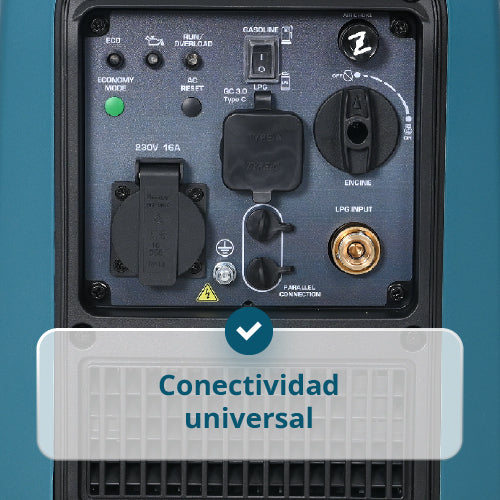 | Equipamiento | Generador, Embalaje, Manual de instrucciones, Llave para bujía, Destornillador PH2 6,0 mm, Funda para accesorios, Llave fija 8×10 mm, Enchufe 230V 16A, Manguera para conexión a bombona de gas con regulador. |