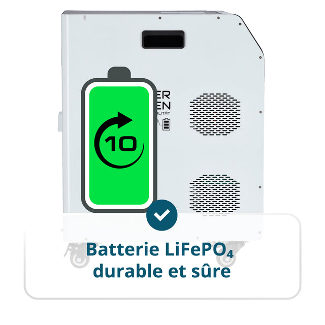 • Batterie LiFePO₄ durable et sûre – jusqu’à 6000 cycles et une durée de vie de plus de 10 ans garantissent un investissement fiable dans l’indépendance énergétique.
