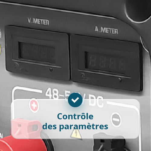 • Fonctionnement automatique – en mode AUTO, le groupe électrogène surveille automatiquement la tension de la batterie, démarre lorsque celle-ci descend en dessous de 50V et s'arrête lorsque la sortie atteint 54,5 ± 0,5 V et que le courant chute sous 20A.