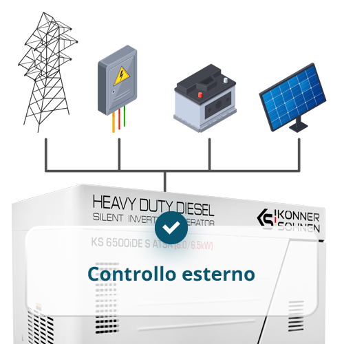 • Controllo esterno – per collegare dispositivi di gestione esterni, consentendo avvio/arresto del generatore e integrazione con sistemi automatici tramite contatti puliti: inverter solari, UPS e altri.