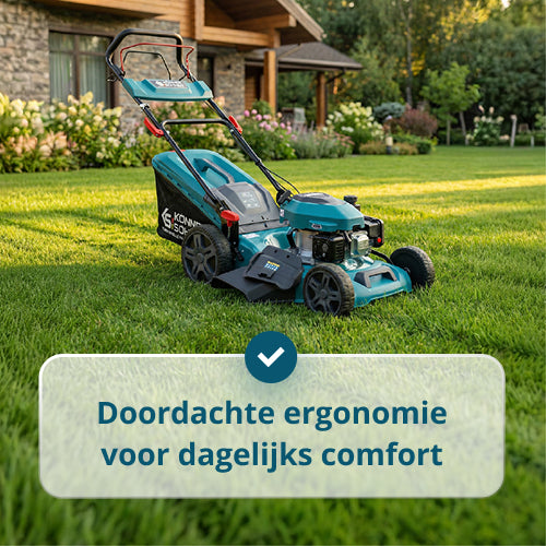 • Comfort, Betrouwbaarheid en Doordachte Ergonomie in Elk Detail. Een innovatieve dekvorm voor verbeterde grasopvang en bescherming van de aandrijfriem, een automatische luchtklep, grote rubberen wielen met diep profiel, handige bedieningshendels, gereedschapsloos opvouwen en compacte opslag zorgen voor comfortabel werken en gemakkelijk dagelijks gebruik.