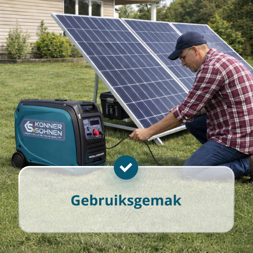 • Automatische werking – in AUTO-modus bewaakt de generator zelfstandig de batterijspanning, start wanneer deze onder 50V daalt en stopt wanneer de output 54,5 ± 0,5 V bereikt en de stroom onder 20A daalt.