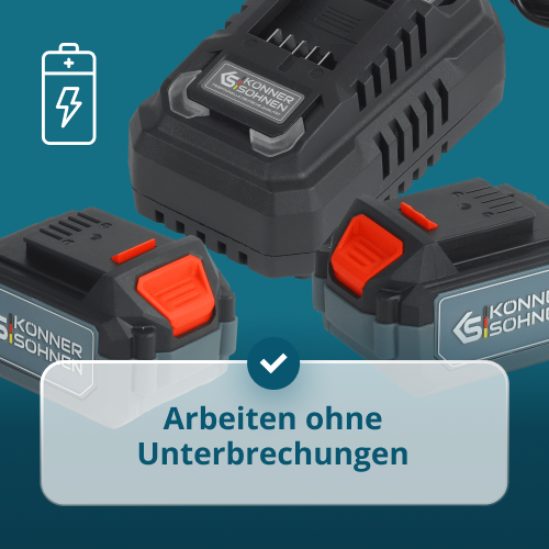 • Unterbrechungsfreies Arbeiten – die zwei 4,0 Ah Akkus und das 4,5 A Ladegerät im Set ermöglichen es, den einen Akku zu laden, während mit dem anderen gearbeitet wird.