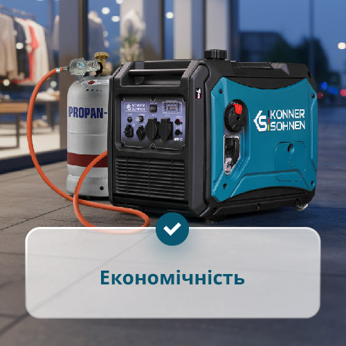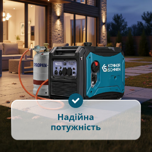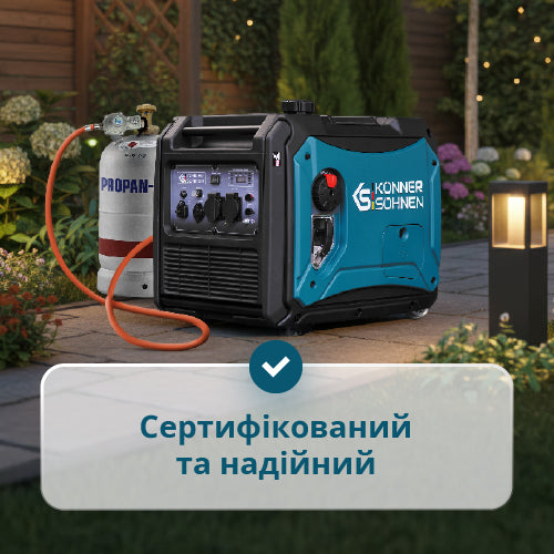| Комплектація | Генератор, Упаковка, Інструкція, Свічний ключ, чохол для аксесуарів, викрутка РН2 6,0 мм, Шланг підключення до газового балону з редуктором |